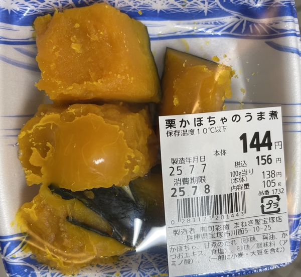 カボチャを砂糖やしょうゆ、カツオエキスで味付けしたもので、水分量が多くてしっとりしている。味付けは鰹だしとしょうゆが濃いので、塩味が強めにある。後味には砂糖の甘さがあり、メリハリがある味に仕上がっている。
